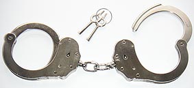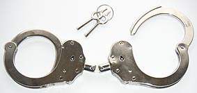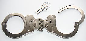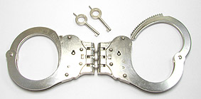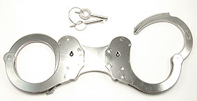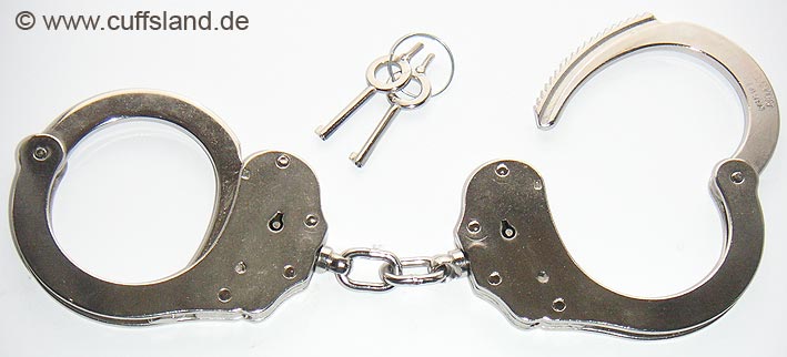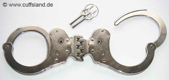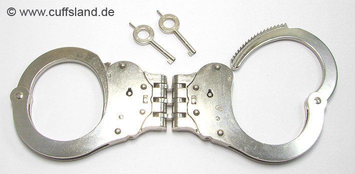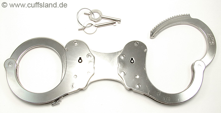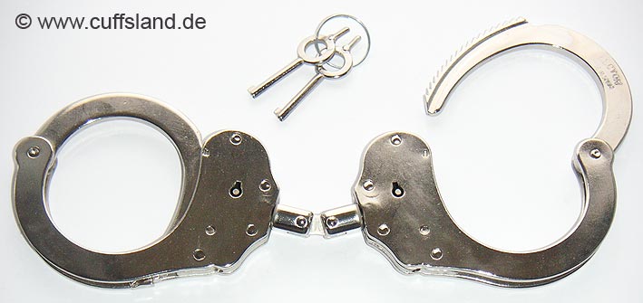 Alcyon Standard-Handschellen in Behördenqualität. Die Fesseln bestehen aus vernickeltem Stahl, die Arretierung erfolgt über den Schlüsseldorn ("Push Button" Prinzip) und kann nur durch Drehen des Schlüssels entgegen der Aufsperrrichtung wieder gelöst werden. Dieses Modell ist durch eine starre Verbindung besonders restriktiv. Der Abstand der Schellen beträgt ca. 2,5 cm. Bezeichnung: 5050S