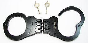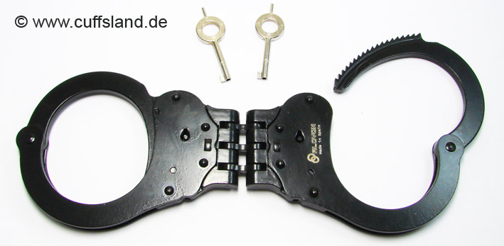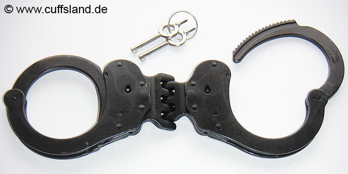 Dieses Modell entspricht dem oben gezeigten Modell 5050-RIG, außer dass die Oberfläche nicht vernickelt, sondern schwarz brüniert ist. Derlei dunkle Fesseln werden bevorzugt von Spezialeinheiten oder Militär eingesetzt. Bezeichnung: A5005