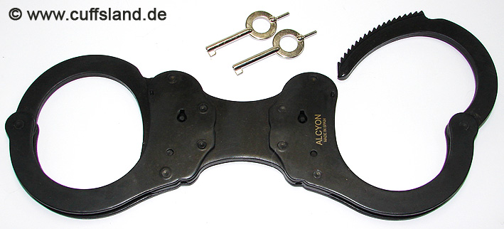 Alcyon Modell 5235 entspricht dem weiter oben gezeigten Modell 5050, außer dass die Oberfläche nicht vernickelt, sondern schwarz brüniert ist. Derlei dunkle Fesseln werden bevorzugt von Spezialeinheiten oder Militär eingesetzt. Es handelt sich um die neue Version mit gehärtetem, schwarzen Kunststoff in der Mittelschicht, um die Fesseln noch leichter zu machen.