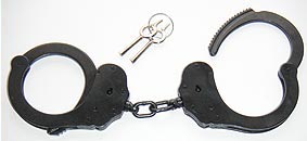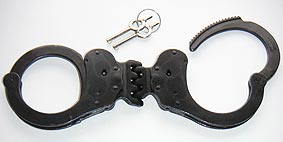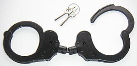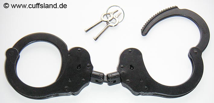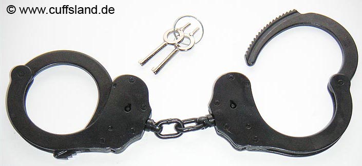 Diese Handschelle entspricht zuvor gezeigtem Modell, außer dass die Oberfläche nicht vernickelt, sondern schwarz lackiert ist. Derlei dunkle Fesseln werden bevorzugt von Spezialeinheiten oder Militär eingesetzt. Bezeichnung: A5235