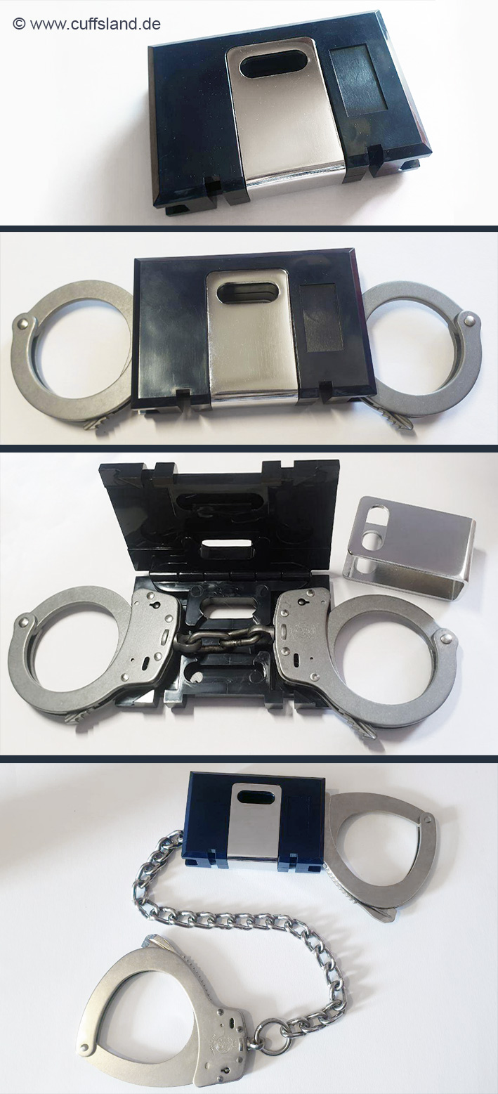Diese Blue Box aus verstärktem ABS Kunststoff und Stahl ist gedacht, um ein gewöhnliches Paar Standard-Handschellen mit Kette in eine starre Fessel zu transformieren. Dazu werden die Handschellen einfach von der Box umschlossen und mit einem Vorhängeschloss gesichert (weder Handschellen noch Vorhängeschloss sind im Lieferumfang enthalten). Die Box kann auch mit einer Peerless Bauchkette kombiniert werden. Das Blue Box System verdeckt darüber hinaus die Schlüssellöcher der Handschellen und erhöht so die Sicherheit. Es passt zu den meisten modernen Standard-Handschellen wie Peerless Modell 300, 400, 500, 700, Smith and Wesson Model 1, 100 oder Hiatt 2010. Um die Schlüssellöcher von Fußschellen zu verdecken, benötigt man zwei Blue Boxes. Bezeichnung: P700N