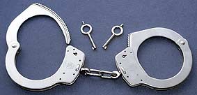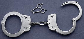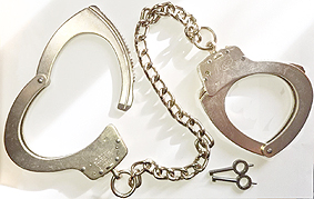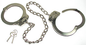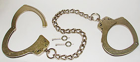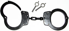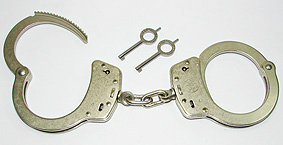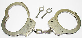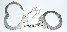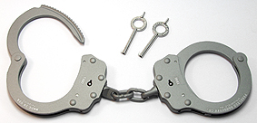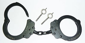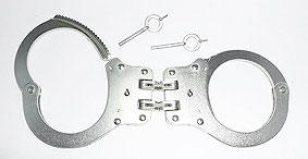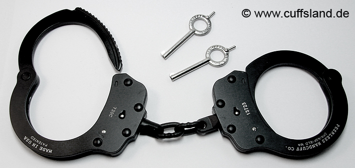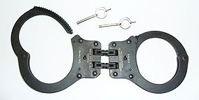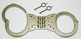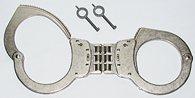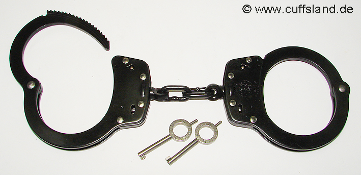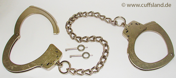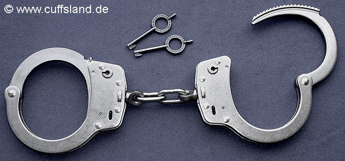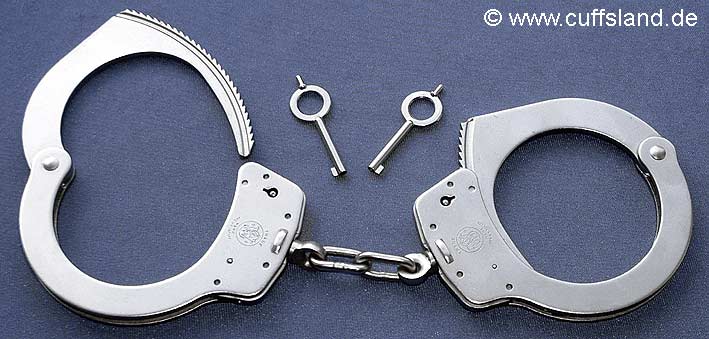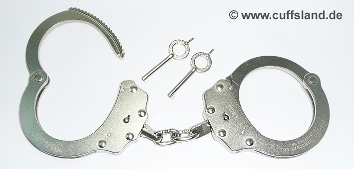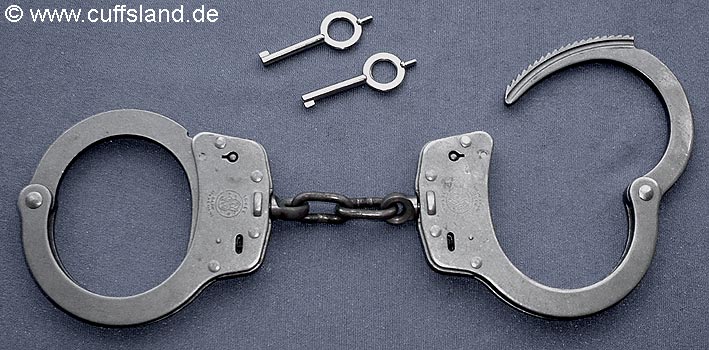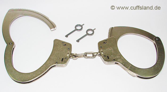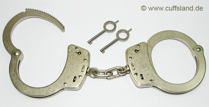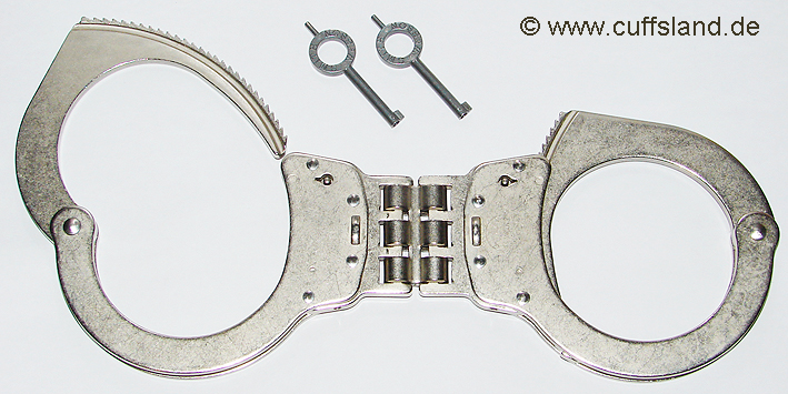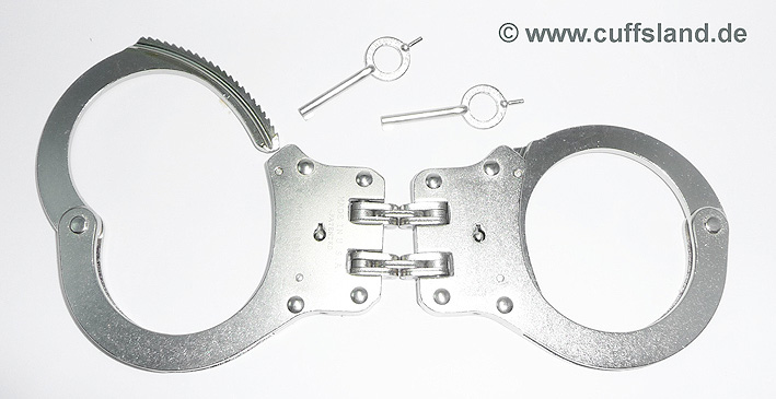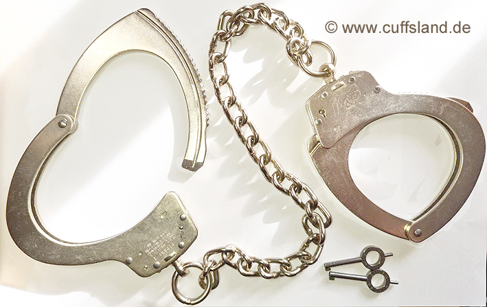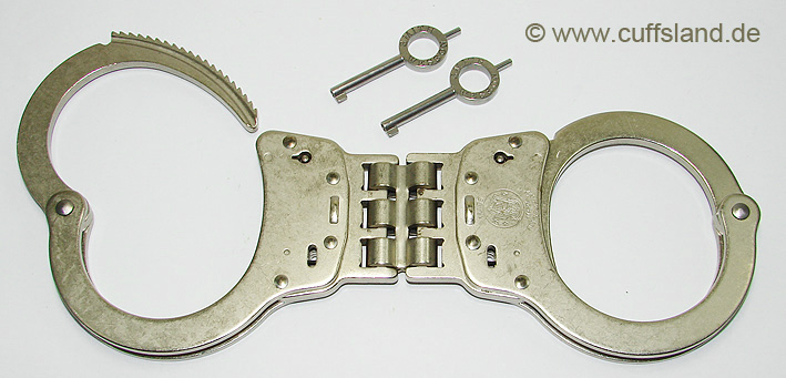 Das Besondere an diesen Gelenk-Handschellen aus vernickeltem Stahl ist ihr Doppelgelenk, welches in etwa kurzen Stücken einer Fahrradkette entspricht. Die Schellen haben einen etwas größeren horizontalen Durchmesser als die meisten anderen Standard-Handfesseln und sind somit auch für stärkere Handgelenke geeignet. Der minimal mögliche Schellenumfang beträgt 163 mm, der maximale 231 mm. Selbstverständlich können die Handschellen sicher arretiert werden, indem man einen kleinen Bolzen an der Seite der Schelle mit dem Schlüsseldorn nach innen drückt. Zum Ent-Arretieren muss der Schlüssel entgegen der Aufsperrrichtung gedreht werden. Auch dieses Peerless-Produkt erfüllt den NIJ-Standard (US National Institute of Justice). Bezeichnung: P802P