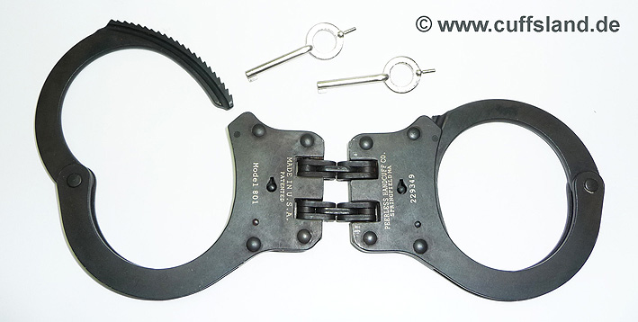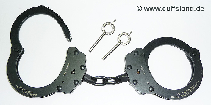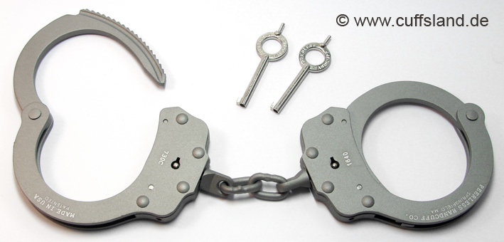 Modell 700 ist die neueste Version der klassischen Peerless-Handschellen mit Durchschlag, die erstmals 1912 auf den Markt kamen und seitdem beständig verbessert wurden. Die Fessel aus nickelbeschichtetem Stahl ist hervorragend verarbeitet und erfüllt den NIJ-Standard (US National Institute of Justice). Der minimal mögliche Schellenumfang beträgt 150 mm, der maximale 211 mm. Selbstverständlich können die Handschellen sicher arretiert werden, indem man einen kleinen Bolzen an der Seite der Schelle mit dem Schlüsseldorn nach innen drückt. Zum Ent-Arretieren muss der Schlüssel entgegen der Aufsperrrichtung gedreht werden. Bezeichnung: P701P