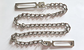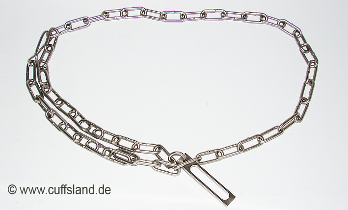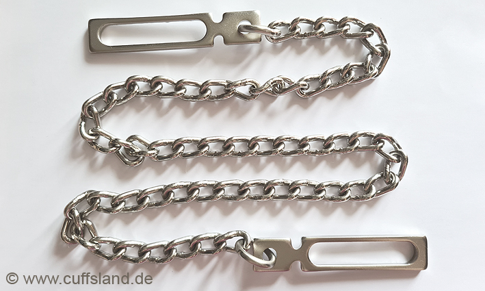 Diese Peerless Verbindungs- bzw. Transportkette kann verwendet werden, um ein Paar Hand- und Fußschellen zu einer sicheren Kombination zu verbinden, ohne extra Vorhängeschlösser zu benutzen. Die Verbindungskette ist (ohne Endstücke) ca. 80 cm lang und erlaubt ein bequemes aufrechtes Stehen/Gehen. Die Innenabmessungen der ovalen "Endringe" betragen ca. 6 cm x 1,3 cm und passen somit zu den meisten flachen Standard-Hand- und Fußschellen-Modellen. Bezeichnung: UZIHS