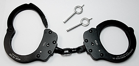 Laut Hersteller sind die M-110 Handschellen für besonders große Handgelenke. Tatsächlich hat man hier zwei Schellen der M-1900 Fußeisen anstatt durch eine lange Kette lediglich durch zwei Kettenglieder verbunden, wodurch man sie auch als extrem restriktive Fußschellen einsetzen kann. Ansonsten weisen auch diese vernickelten Fesseln die gewohnt hohe Smith & Wesson Qualität auf. Sie sind hervorragend verarbeitet und selbstverständlich sicher arretierbar - man fährt mit dem Schlüsseldorn in den Schlitz und drückt dort einen kleinen Stift in Richtung Schlüsselloch. Diese Sperre gegen weiteres Engerstellen wird durch Drehen des Schlüssels entgegen der Aufsperrrichtung wieder gelöst. Diese Fesseln sind auch in schwarz ("blued") erhältlich. Bezeichnung: SWM01