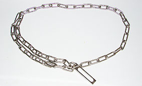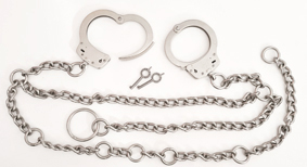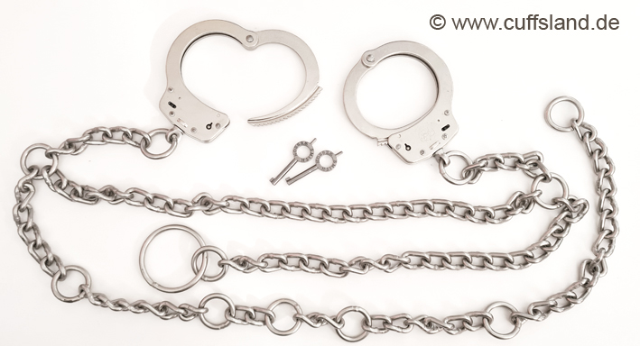 Smith & Wesson M-1800: Bauchkette mit Smith & Wesson M-100-1 Handschellen. Die Kette ist in drei Teile gegliedert. Der Abstand vom großen O-Ring bis zur Anbringung der ersten Handschelle beträgt ca. 30 cm. Die Länge zwischen den Handschellen ist ca. 35 cm. Der Rest der Kette ist noch 65 cm lang (gesamt also ca. 130 cm plus jeweils noch ca. 7 cm von der Kette bis zur Schelle). Natürlich weisen auch diese vernickelten Fesseln die gewohnt hohe Smith & Wesson Qualität auf. Bezeichnung: S1900