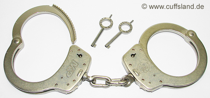M-100 ist der Klassiker der US-amerikanischen Polizeiausrüstung. Die vernickelten Handschellen sind hervorragend verarbeitet und selbstverständlich arretierbar. Die Arretierung wird übrigens ausgelöst, indem man mit dem Schlüsseldorn in den Schlitz fährt und dort einen kleinen Stift in Richtung Schlüsselloch drückt. Diese Sperre gegen weiteres Enger-Stellen wird durch Drehen des Schlüssels entgegen der Aufsperrrichtung wieder gelöst. Diese Handschellen sind auch in schwarz erhältlich ("blued", was nicht dem "melonite" entspricht). Bezeichnung: 100ME