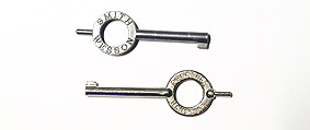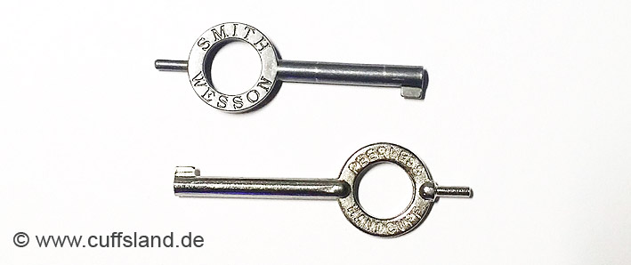 Original Smith & Wesson oder Peerless Standard-Schlüssel, die nicht nur zu den Modellen der jeweiligen Firma, sondern auch zu vielen anderen modernen Handschellen passen (im Zweifelsfalle einfach nachfragen). Der Smith & Wesson Schlüssel ist am Griff etwas dicker und somit griffiger als die meisten anderen Standard-Schlüssel.