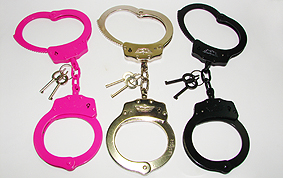 Diese etwas einfachere Handschellen-Version (nicht gespiegelte Schellen) ist ebenfalls offiziell von UZI lizenziert. Das UZI-Logo ist auf beiden Schellen eingestanzt. Selbstverständlich können diese Handschellen aus vernickeltem Stahl sicher arretiert werden, indem man einen kleinen Bolzen an der Seite der Schelle mit dem Schlüsseldorn nach innen drückt. Zum Ent-Arretieren muss der Schlüssel entgegen der Aufsperrrichtung gedreht werden. Dieses Modell gibt es aktuell in drei Ausführungen: vernickelt sowie schwarz oder pink lackiert. Bezeichnung: UZIFS