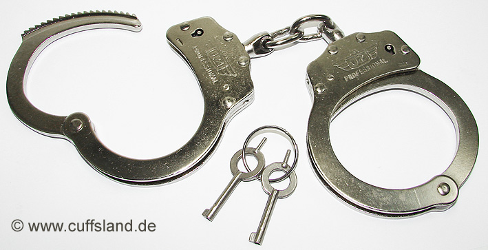 Diese Handschellen sind offiziell von UZI, dem Hersteller der weltberühmten gleichnamigen Maschinenpistole, lizenziert. Das UZI-Logo ist auf beiden Schellen eingestanzt. Es handelt sich um qualitativ hochwertige Fesseln aus vernickeltem Stahl, die für den offiziellen Behördeneinsatz hergestellt werden. Selbstverständlich können die Handschellen sicher arretiert werden, indem man einen kleinen Bolzen an der Seite der Schelle mit dem Schlüsseldorn nach innen drückt. Zum Ent-Arretieren muss der Schlüssel entgegen der Aufsperrrichtung gedreht werden. Bezeichnung: UZISH